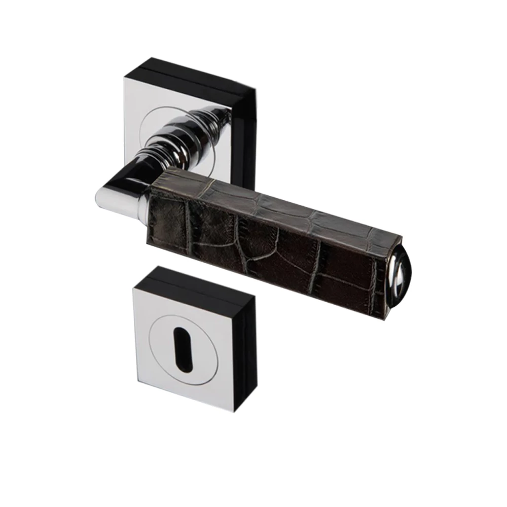 Glass Design CUBE Leather sötétbarna bőr / fényes króm négyzetrozettás kilincsgarnitúra CUBELBRF4OP9