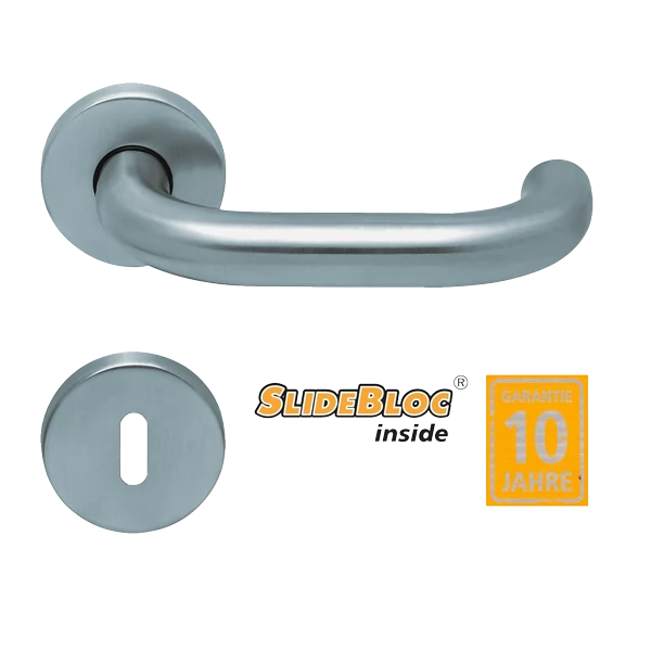 2 db kilincsszár, 1 db kilincstengely, kör alakú rozetták, SlideBloc Light alaplapok, rögzítéshez szükséges csavarok, a kilincsszár megfogatásához szükséges hernyócsavarok és imbuszkulcs.