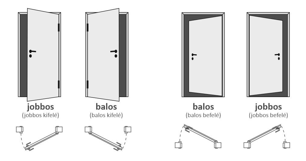 Az ajtó pánt felöli oldalán (tehát ha magunk felé húzzuk az ajtót), amelyik oldalra esik a pánt, azzal megegyező az ajtó nyitásiránya.