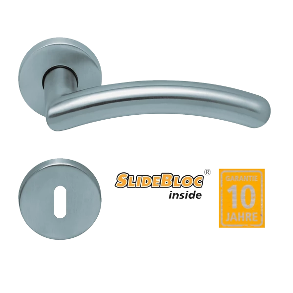 2 db kilincsszár, 1 db kilincstengely, kör alakú rozetták, SlideBloc alaplapok, rögzítéshez szükséges csavarok, a kilincsszár megfogatásához szükséges hernyócsavarok és imbuszkulcs.